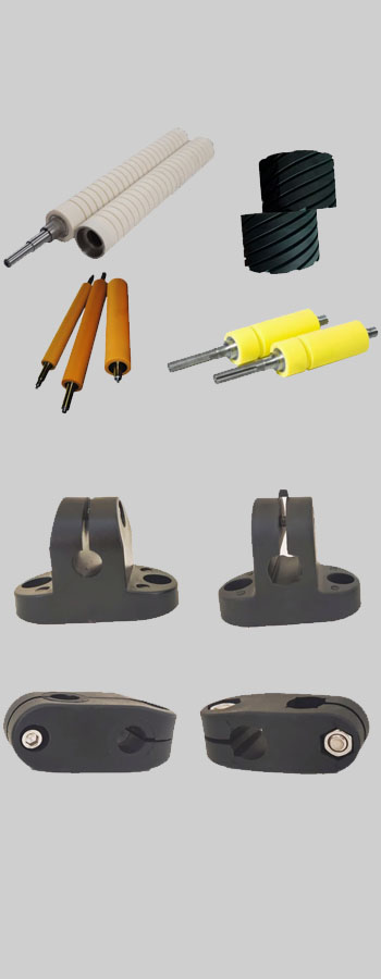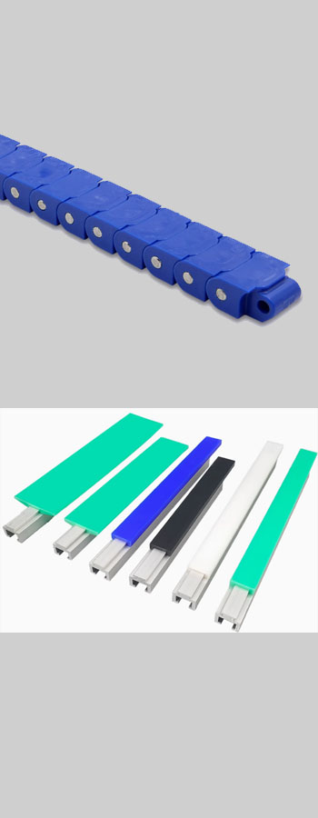 输送配件类:平顶链板、模块式网链、龙骨链、链轮、白铁骨架、铝轨、垫条、耐磨条、连接件、挂瓶条、托轮、护栏、护栏夹、护栏支架、脚盘、脚套、支架、托架、导轨、梳形过渡板、螺杆和星轮、自由式滚筒、卡入式滚筒、强制滚筒、堆积滚筒、锥形滚筒、电动滚筒等。